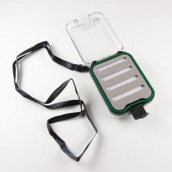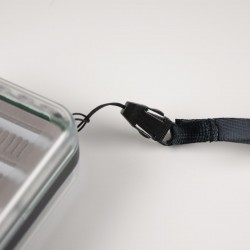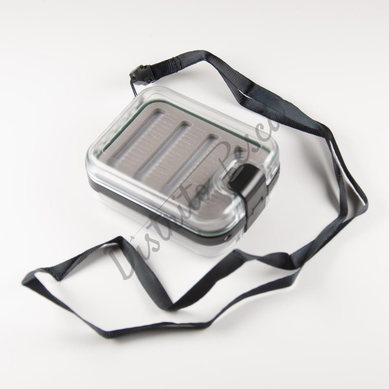 Caja pequeña con tapas transparentes. Estanca. Incluye cordón para colgar del cuello.