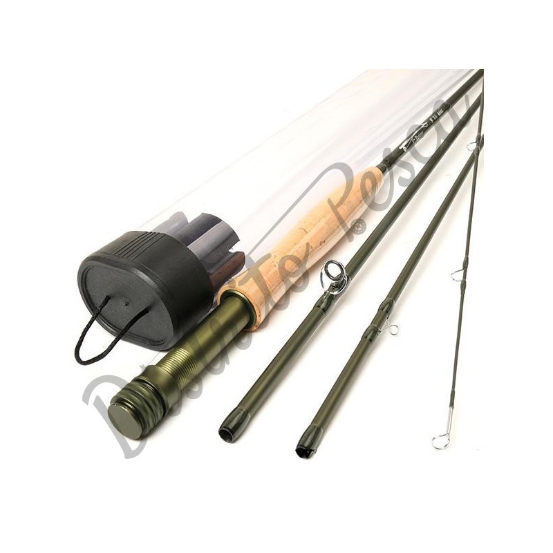 Caña de mosca fabricada con carbono SK 24T, con anillas plateadas, empuñadura de corcho A y portacarretes de aluminio.
