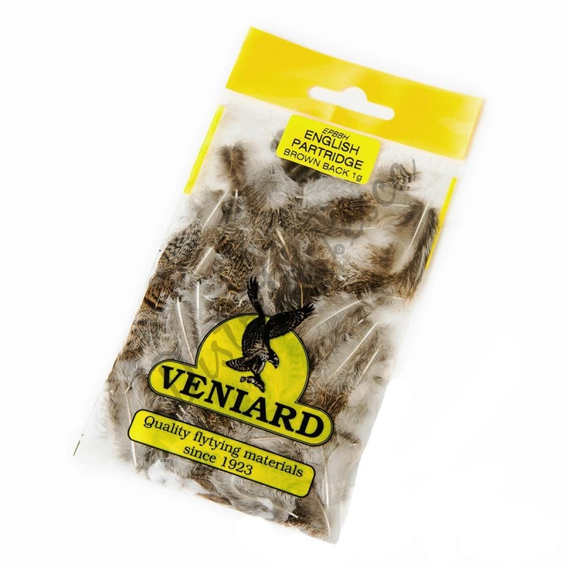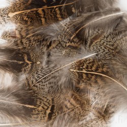 Las plumas de lomo de perdiz pardilla de Veniard son plumas seleccionadas de la espalda de la perdiz pardilla. Plumas rayadas en color marrón y negro.