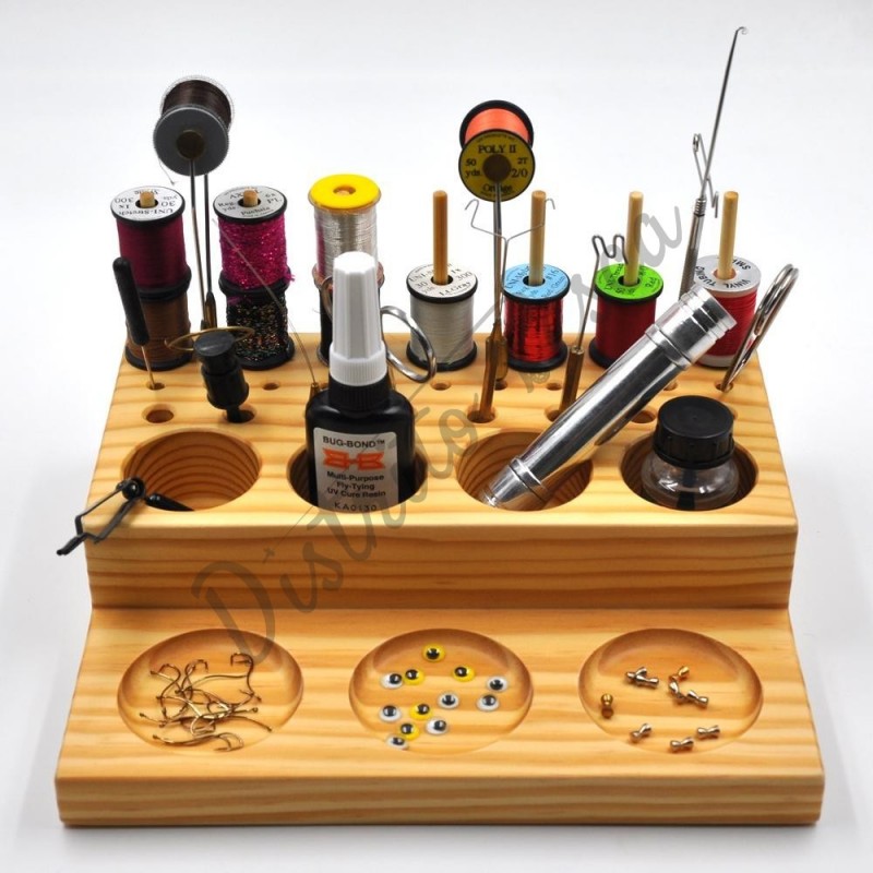 Con capacidad para 14 bobinas de hilo de montaje. Con 11 agujeros de 5.4 mm de diámetro y otros 8 de 10 mm de diámetro para organizar herramientas de montaje. Cuenta con 4 cavidades de 45 mm de diámetro y gran profundidad para botes o herramientas de gran tamaño. También tiene 3 prácticas hendiduras para tener a mano anzuelos, ojos, cabezas, etc.