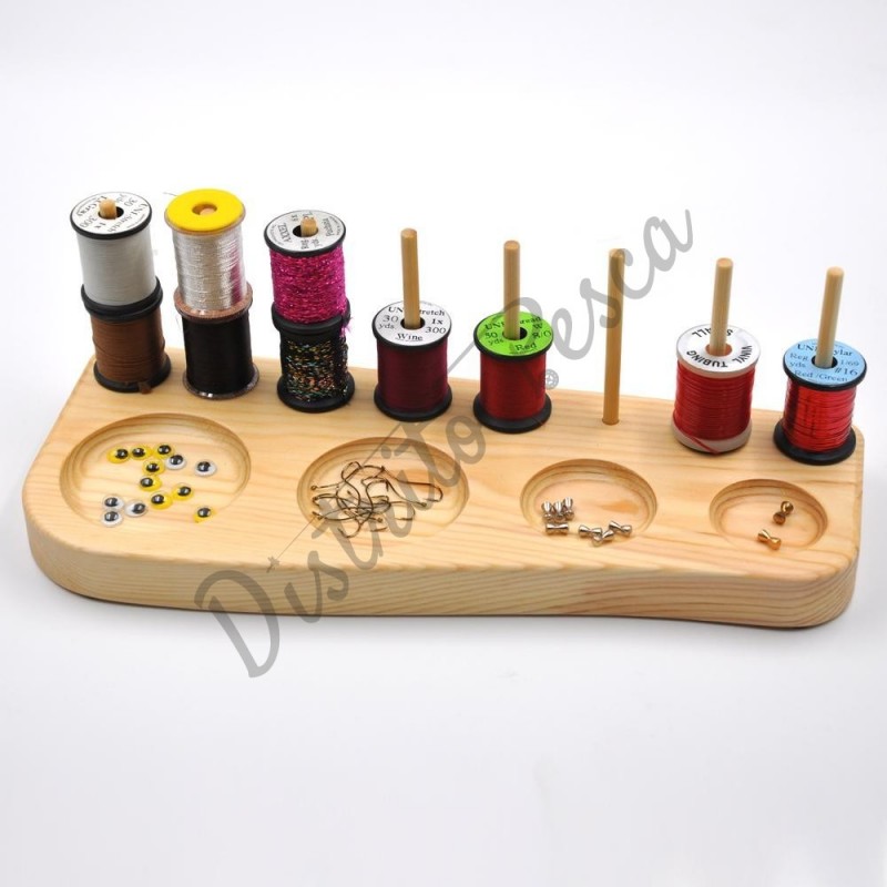 Con capacidad para 16 bobinas de hilo de montaje. también tiene 4 prácticas hendiduras para tener a mano anzuelos, ojos, cabezas, etc.